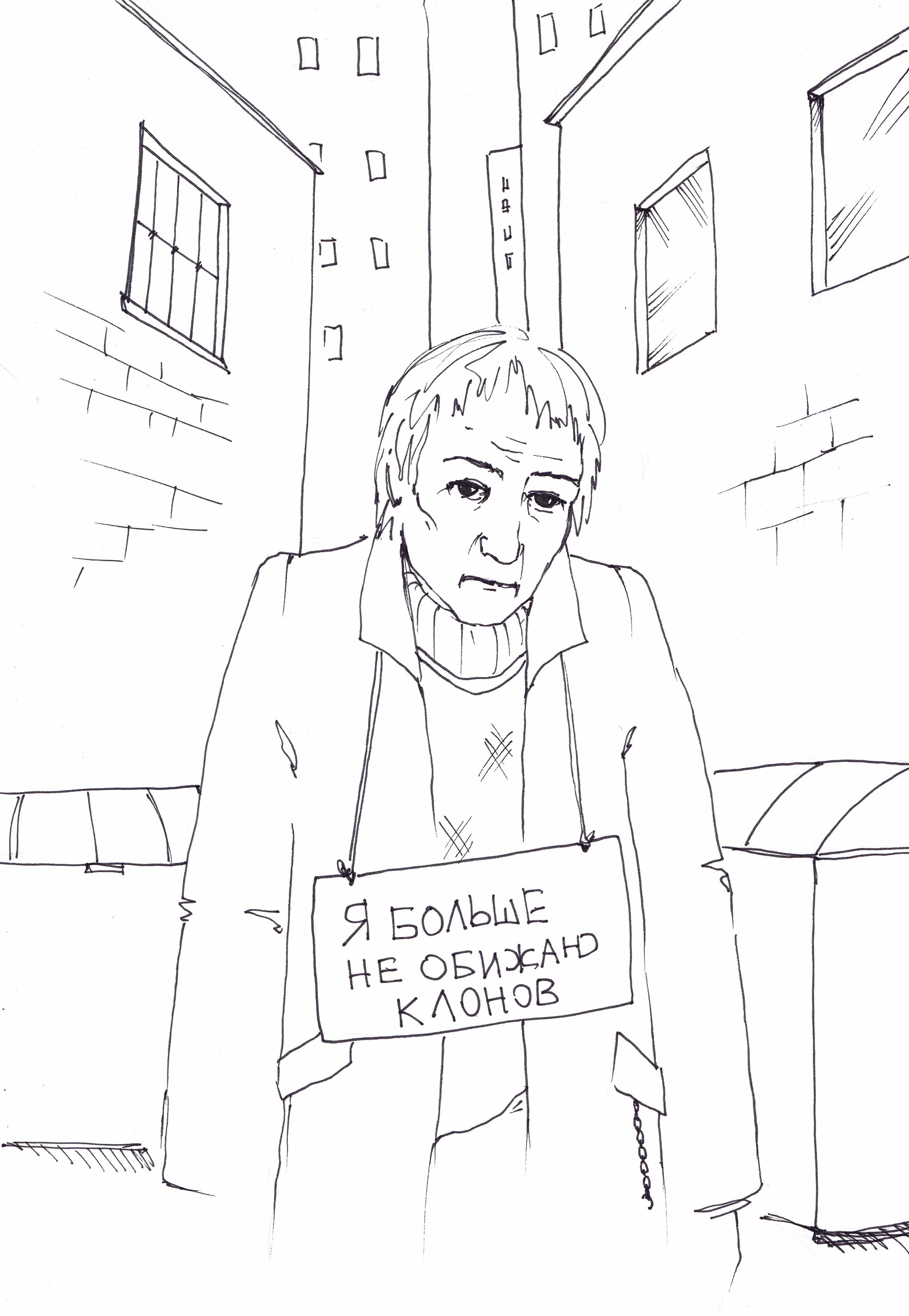 Кто-то подошел к Никки сзади и повесил на шею табличку. Скосив глаза вниз, он прочитал: “Я больше не обижаю клонов”. Пару раз сверкнула фотовспышка.