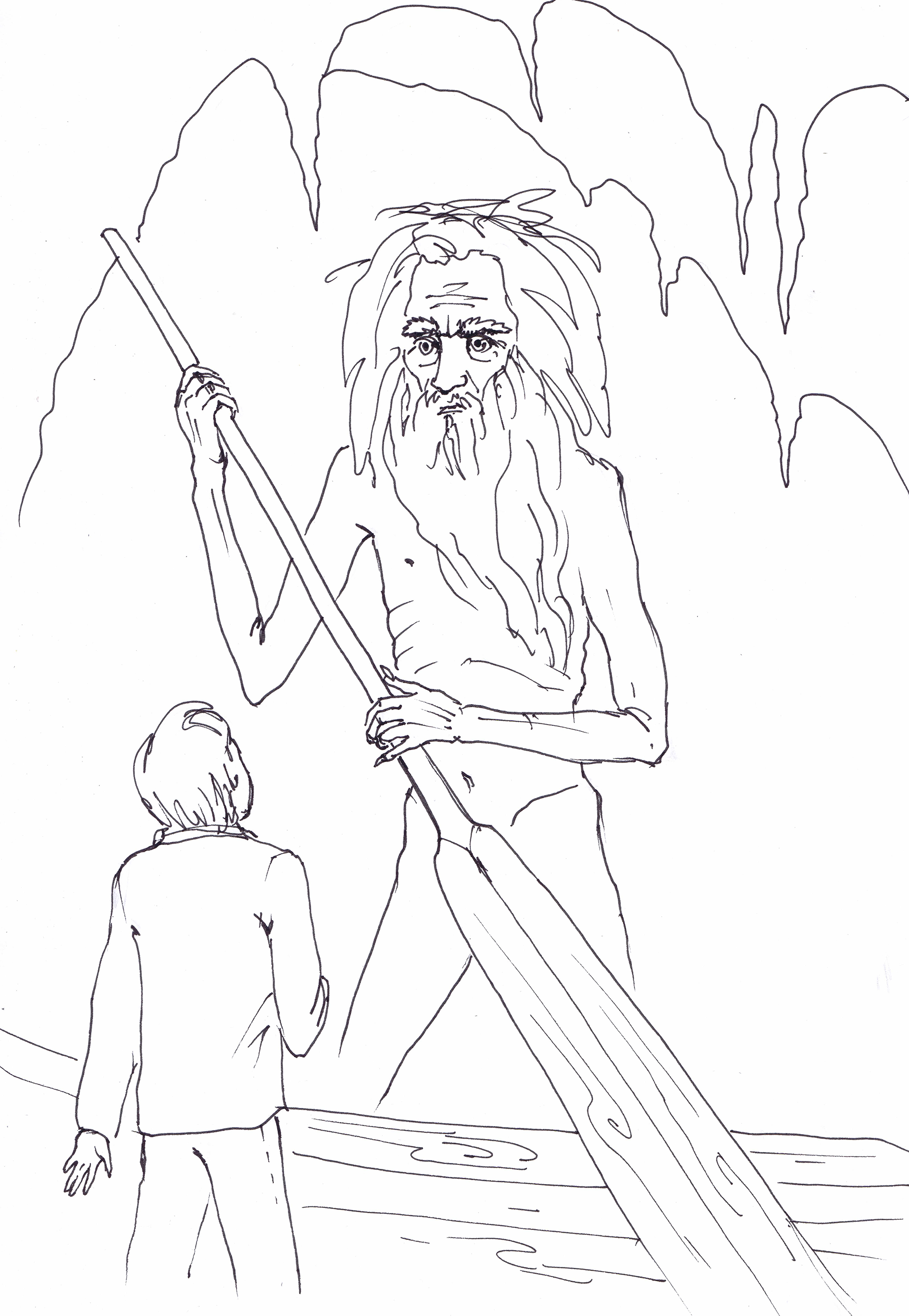 Говоривший чёрно-белым пятном выделялся на фоне противных серых сумерек: тёмная кожа, запущенная седая грива и борода, а из одежды лишь чёрное весло в жилистых ручищах с белыми ногтями. Был он нечеловечески высок и столь костляв, словно голодает уже пару веков. Особенной жути нагоняли сверкающие из-под косматых белых бровей бешеные глаза.