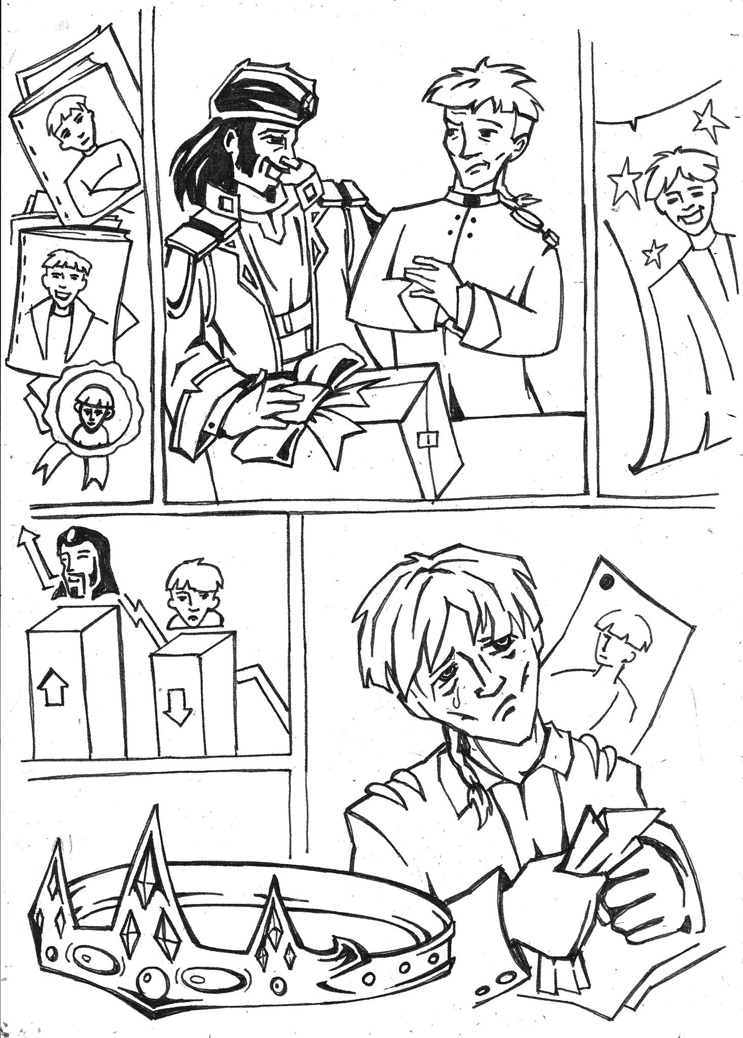 Его Величество вручил ему увесистую коробку. Отравитель хотел было по привычке швырнуть её обратно, но после недолгих колебаний решил не повторяться и, храня на лице брезгливое выражение, разорвал обёртку. Открыв крышку, он вскрикнул и отбросил коробку прочь, словно обнаружил внутри клубок змей. Выпавшая из неё золотая корона покатилась, дробно стуча рубинами и алмазами по паркету, и остановилась у самых ног Императора. Тот поднял её, бегло осмотрел в поисках повреждений и с улыбкой произнёс: