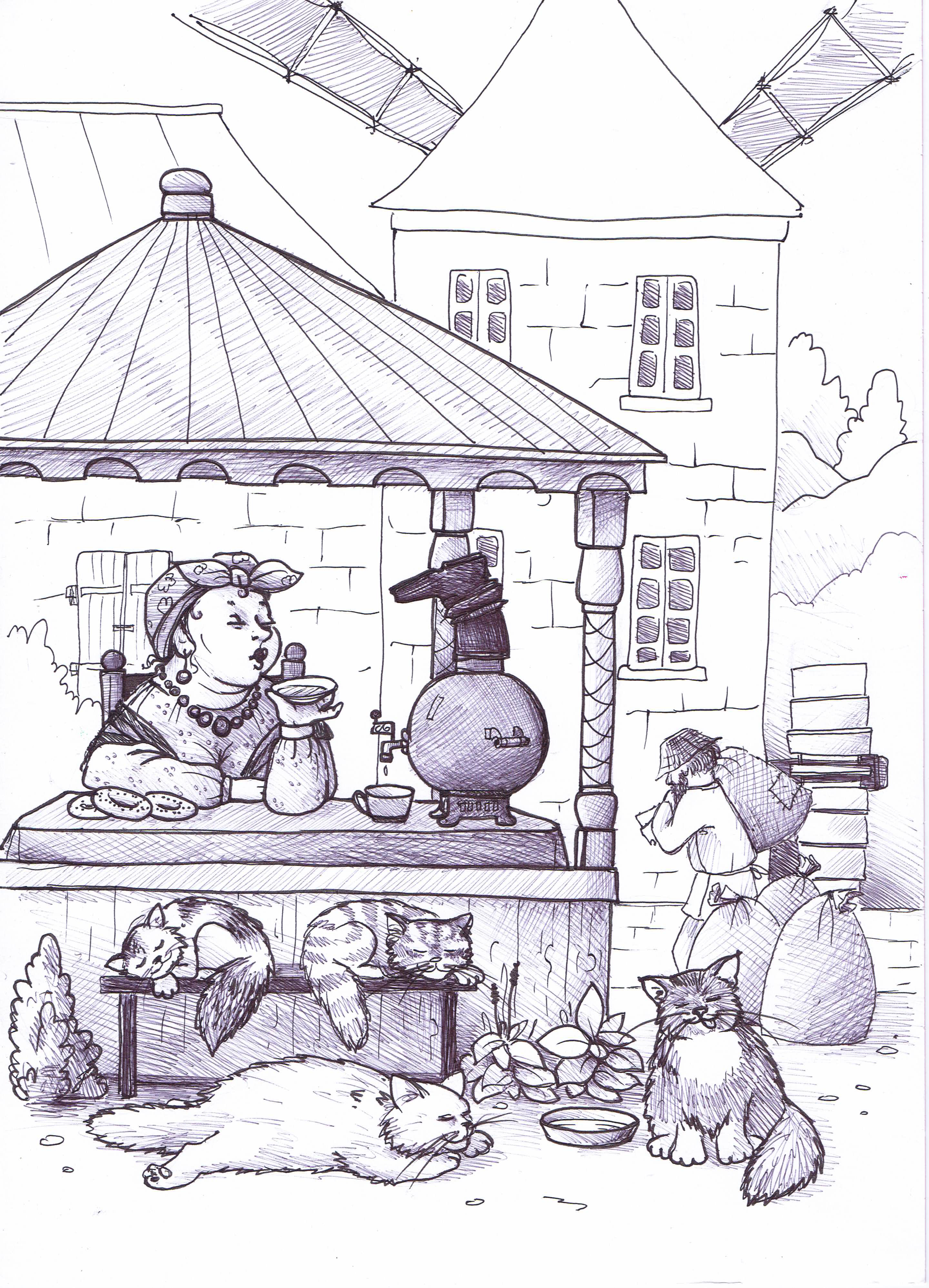 Хорошо жилось Мельничихе при хане. Вон, ворота новые, к дому крыльцо резное пристроила, во дворе - беседка с вьюнками, чаи гонять. Удобно беседка стоит. Всё немалое хозяйство из неё легко обозревается и можно на работников покрикивать не отходя от самовара. Благодать! Кругом, как положено при мельнице, кошек видимо-невидимо - рыжих, серых, пёстрых, полосатых и ещё чёрт те каких, да все под стать вдове: упитанные, рожи наглые, взгляд хозяйский. Кошкам здесь тоже хорошо жилось.